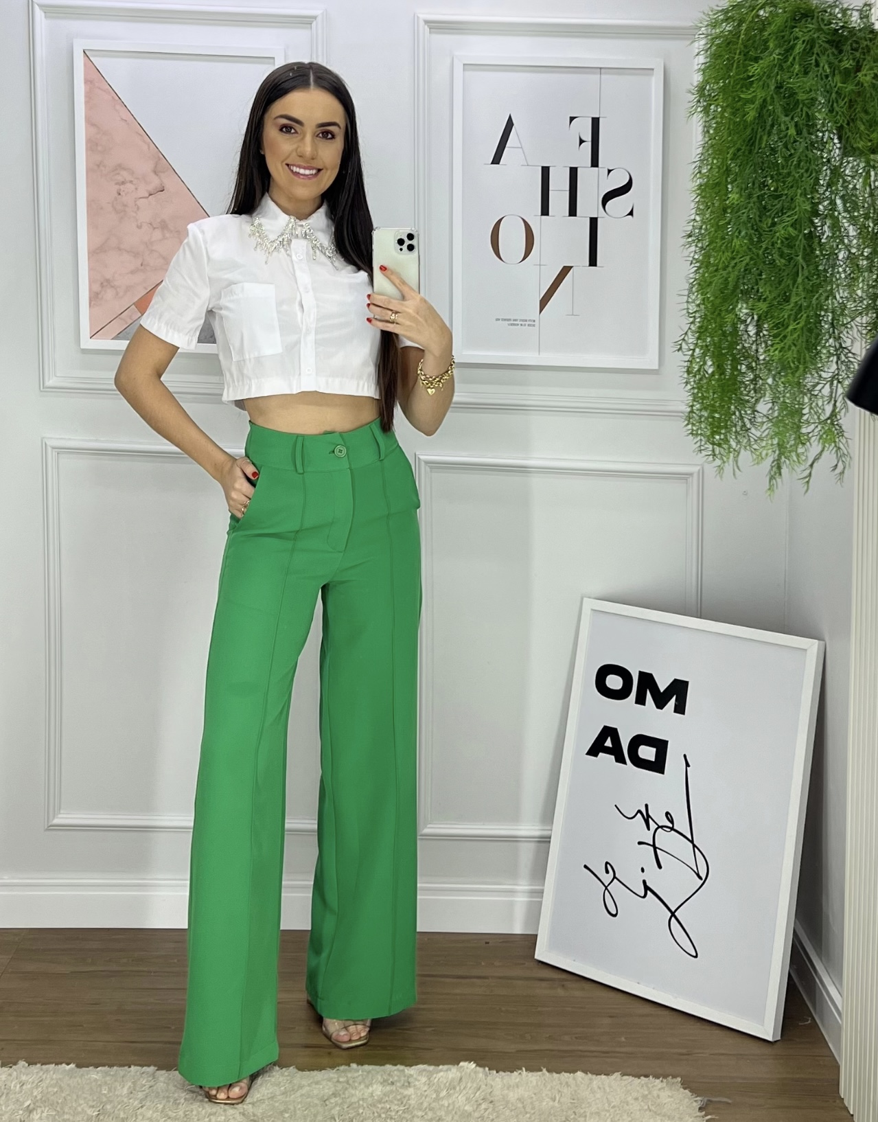 Camisa Cropped tricoline detalhe de strass na gola e bolso frontal